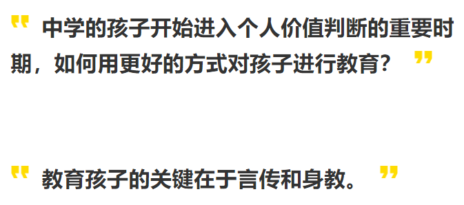 这么多年的经历告诉我,教育孩子的关键就四个字——言传身教。言传在小的时候是很重要的,要给孩子讲非常具体的道理,让孩子有同理心、同情心。此外,家长讲道理的时候,不要唠叨和反复,因为唠叨的家长更多是满足自己的需求。事实上,家长们要记住,有效的教育比所谓正确的教育重要得多。我的母亲是一个老师,她从小就对我说“响鼓不用重锤”,她讲道理真的只讲一次,然后就看我自己做不做。随着孩子年龄的增长,身教就变得越来越重要。因为你的孩子长大了,该知道的道理都知道了,他看的更多是你怎么做的。比如有的家长,他说孩子你要好好学习、乐于助人,结果自己天天在那儿搓麻将,而且对人很刻薄。这样孩子长大以后,家长说什么他根本听不进去,因为家长自己就言行不一。家长要把自己的真实想法开诚布公,比如有些家长很看重分数,却对孩子说考多少不重要,只要快乐就好了,其实不要这样,在孩子面前,如果真的很看重分数,就告诉孩子分数很重要,因为将来高考就是决定你上哪个学校,当然这是家长的想法,孩子可以不接受。 家长要放宽心,中学生到了这个阶段已经有了自己的判断能力,我们要放手让他去观察、去思考、去交友、去行动,你需要给孩子一些非常具体的帮助。比如说孩子的数学学习出现了问题,这个时候不需要跟他讲数学学不好会怎样,需要去跟他交流,试着问孩子“你在数学上面遇到什么具体的困难”,“怎样才能帮助你”等,这样孩子能听得进去,又能解决具体的问题。