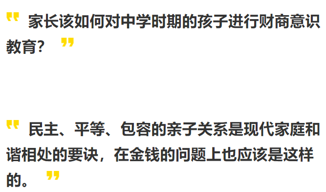 我认为民主、平等、包容的亲子关系是现代家庭和谐相处的要诀,在金钱的问题上也应该是这样的。对于中学生来说,就算不告诉家里的财政状况、收支状况,他迟早也是会知道的,重要的是要让孩子养成一个正确的金钱的观念和态度,让孩子知道这个钱是父母辛苦挣来的,要量力而行。假如家里经济条件不是很好,也要让孩子知道没有钱本身不是耻辱,将来通过努力是可以改变这种状况。对于中学生来说,家长每个星期或者每个月可以固定给孩子一笔钱,用来日常支出。不过,有的孩子可能第一个月会花得很快,到后面基本没有钱吃饭了,在这个时家长不能帮助,让他自己去想办法。因为要让他知道用完就没了,下个月他就会学着分配,这就是一个很好的锻炼过程。有些家长害怕孩子乱花钱不敢这么做,其实大家要知道人生的成长不是完全不犯错误的,有的时候就是一个试错的过程,你永远给他什么都安排好了,最后反而有可能会出大问题。所以家长可以尝试给孩子一个账号,让他自主支配一定数量的金钱。但是前提要跟孩子商量好这笔钱的用途,譬如出国游学等将会从这笔钱里出。成年以后,假如还有剩余的话,也会交给他,以此培养他对金钱分配的能力。我认识一个善于投资的爸爸,他跟孩子说,“儿子你已经有4万块钱了,我拿去给你投资”。但是爸爸会告诉他投资在哪里,增收的时候也告诉他是怎么实现增加收益的。如果是亏了,也会坦白告诉他,我觉得这也是一个不错的办法。总之,在现代家庭当中,隐瞒或者隐藏什么是不好的,尤其初中高中的孩子,应该平等、民主、包容地处理亲子关系。